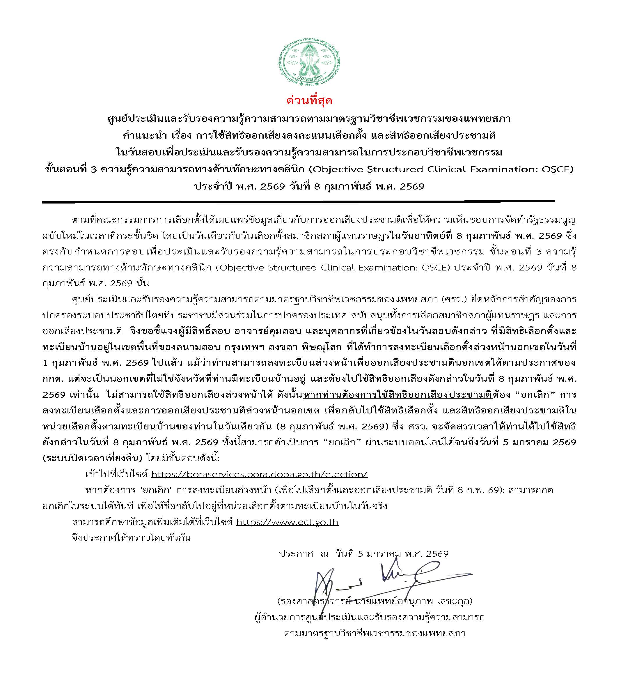 ตามที่คณะกรรมการการเลือกตั้งได้เผยแพร่ข้อมูลเกี่ยวกับการออกเสียงประชามติเพื่อให้ความเห็นชอบการจัดทำรัฐธรรมนูญฉบับใหม่ในเวลาที่กระชั้นชิด โดยเป็นวันเดียวกับวันเลือกตั้งสมาชิกสภาผู้แทนราษฎรในวันอาทิตย์ที่ 8 กุมภาพันธ์ พ.ศ. 2569 ซึ่งตรงกับกำหนดการสอบเพื่อประเมินและรับรองความรู้ความสามารถในการประกอบวิชาชีพเวชกรรม ขั้นตอนที่ 3 ความรู้ความสามารถทางด้านทักษะทางคลินิก (Objective Structured Clinical Examination: OSCE) ประจำปี พ.ศ. 2569 วันที่ 8 กุมภาพันธ์ พ.ศ. 2569 นั้นศูนย์ประเมินและรับรองความรู้ความสามารถตามมาตรฐานวิชาชีพเวชกรรมของแพทยสภา (ศรว.) ยึดหลักการสำคัญของการปกครองระบอบประชาธิปไตยที่ประชาชนมีส่วนร่วมในการปกครองประเทศ สนับสนุนทั้งการเลือกสมาชิกสภาผู้แทนราษฎร และการออกเสียงประชามติ จึงขอชี้แจงผู้มีสิทธิ์สอบ อาจารย์คุมสอบ และบุคลากรที่เกี่ยวข้องในวันสอบดังกล่าว ที่มีสิทธิเลือกตั้งและทะเบียนบ้านอยู่ในเขตพื้นที่ของสนามสอบ กรุงเทพฯ สงขลา พิษณุโลก ที่ได้ทำการลงทะเบียนเลือกตั้งล่วงหน้านอกเขตในวันที่ 1 กุมภาพันธ์ พ.ศ. 2569 ไปแล้ว แม้ว่าท่านสามารถลงทะเบียนล่วงหน้าเพื่อออกเสียงประชามตินอกเขตได้ตามประกาศของ กกต. แต่จะเป็นนอกเขตที่ไม่ใช่จังหวัดที่ท่านมีทะเบียนบ้านอยู่ และต้องไปใช้สิทธิออกเสียงดังกล่าวในวันที่ 8 กุมภาพันธ์ พ.ศ. 2569 เท่านั้น ไม่สามารถใช้สิทธิออกเสียงล่วงหน้าได้ ดังนั้นหากท่านต้องการใช้สิทธิออกเสียงประชามติต้อง “ยกเลิก” การลงทะเบียนเลือกตั้งและการออกเสียงประชามติล่วงหน้านอกเขต เพื่อกลับไปใช้สิทธิเลือกตั้ง และสิทธิออกเสียงประชามติในหน่วยเลือกตั้งตามทะเบียนบ้านของท่านในวันเดียวกัน (8 กุมภาพันธ์ พ.ศ. 2569) ซึ่ง ศรว. จะจัดสรรเวลาให้ท่านได้ไปใช้สิทธิดังกล่าวในวันที่ 8 กุมภาพันธ์ พ.ศ. 2569 ทั้งนี้สามารถดำเนินการ “ยกเลิก” ผ่านระบบออนไลน์ได้จนถึงวันที่ 5 มกราคม 2569 (ระบบปิดเวลาเที่ยงคืน) โดยมีขั้นตอนดังนี้: